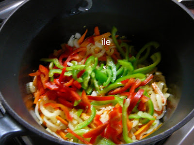 Ahora agregamos los morrones o pimientos cortados en fina Juliana.