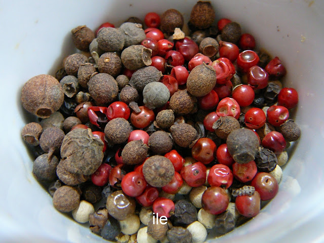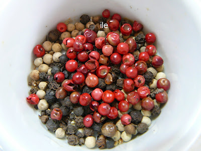 Agrego la pimienta rosa, en realidad no es pimienta es la fruta de un árbol que se llama aguaribay, muchas plazas de Buenos Aires en Agosto o en Septiembre, se ve el árbol cargado de racimos de estas frutas rojas, y mucha gente juntandolas, tiene el picor de la pimienta.