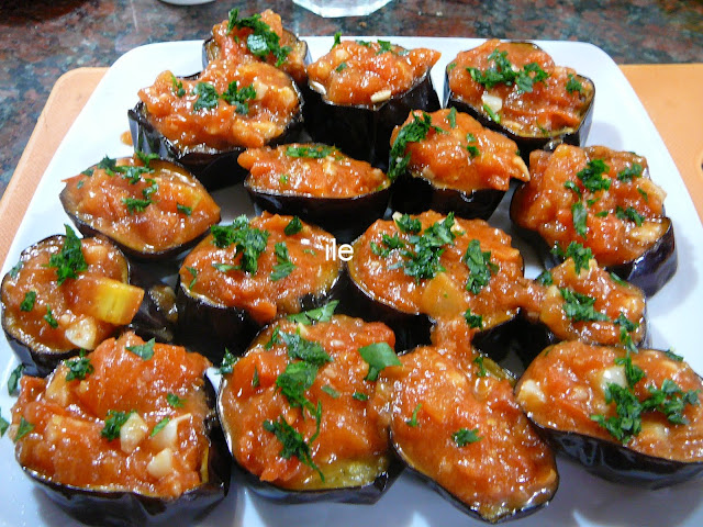 También las he visto que las preparaban con la berenjena partida al medio, pero creo que de esta manera quedan mucho más lindas y el tamaño justo para hacer una tapita o un snack.