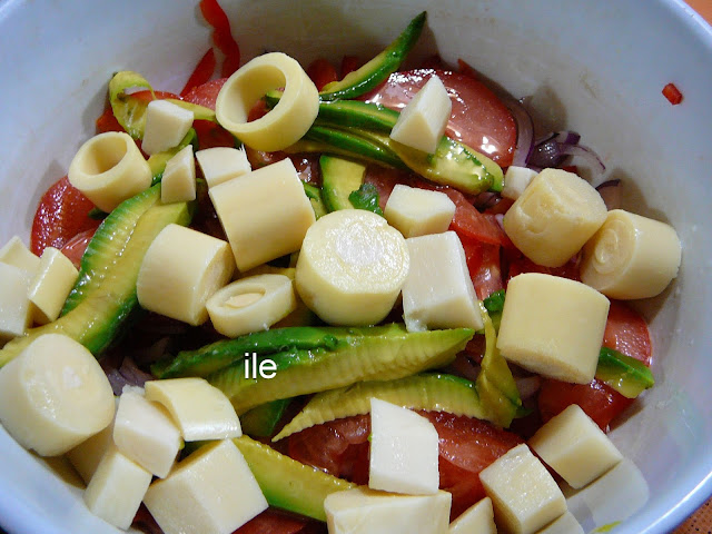 Por último agrego  los palmitos escurridos, no los corté en trozos chicos, porque me gustan saborearlos mientras los mastico.