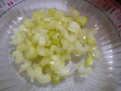 Lavo las varas de apio, le saco los hijos y lo corto en rodajas finas, y las voy poniendo dentro de un bol o ensaladera.