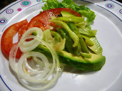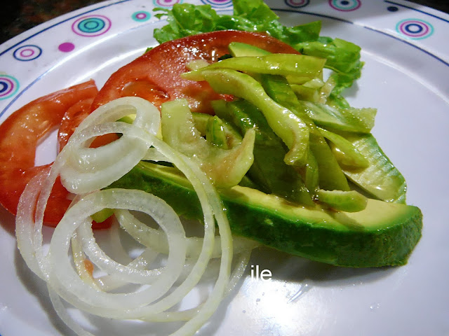 Acá lo tengo servido en mi plato, preparé una ensalada de lechuga criolla, con apio o celery, tomate cortado en rodajas, cebolla en rodajas, unas rebanadas de palta o aguacate Hass y la ochojcha cortada en fina Juliana.