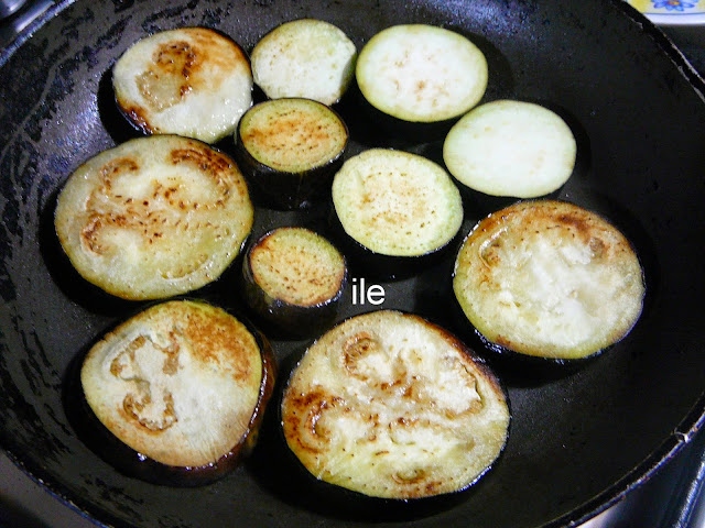 En una sartén o en una plancha pongo una capa muy fina de aceite, cuando está caliente, acomodo las rodajas de berenjenas y las dejo cocinar, que se doren de ambas caras.