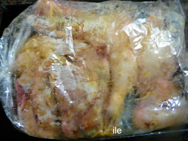 Abro la bolsa y voy acomodando las piezas de pollo y poniendo la mezcla que preparamos.