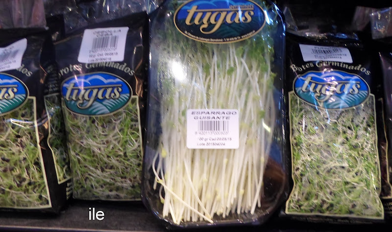 Entre los brotes que vi estos me llamaron la atención los espárragos guisantes (arvejas) también había brotes de alfalfa, de rabanito y de soja todo en bolsas pequeñas.