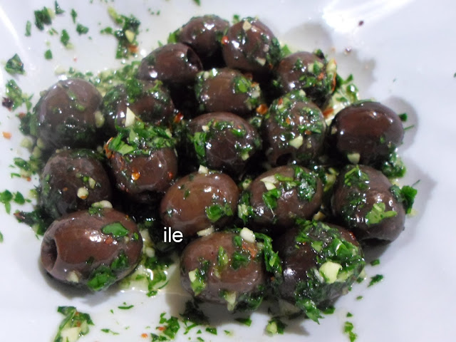 Estas aceitunas así aliñadas con ajo, perejil, ají molido y aceite de oliva son deliciosas y cuando los pones en la mesa desaparecen.